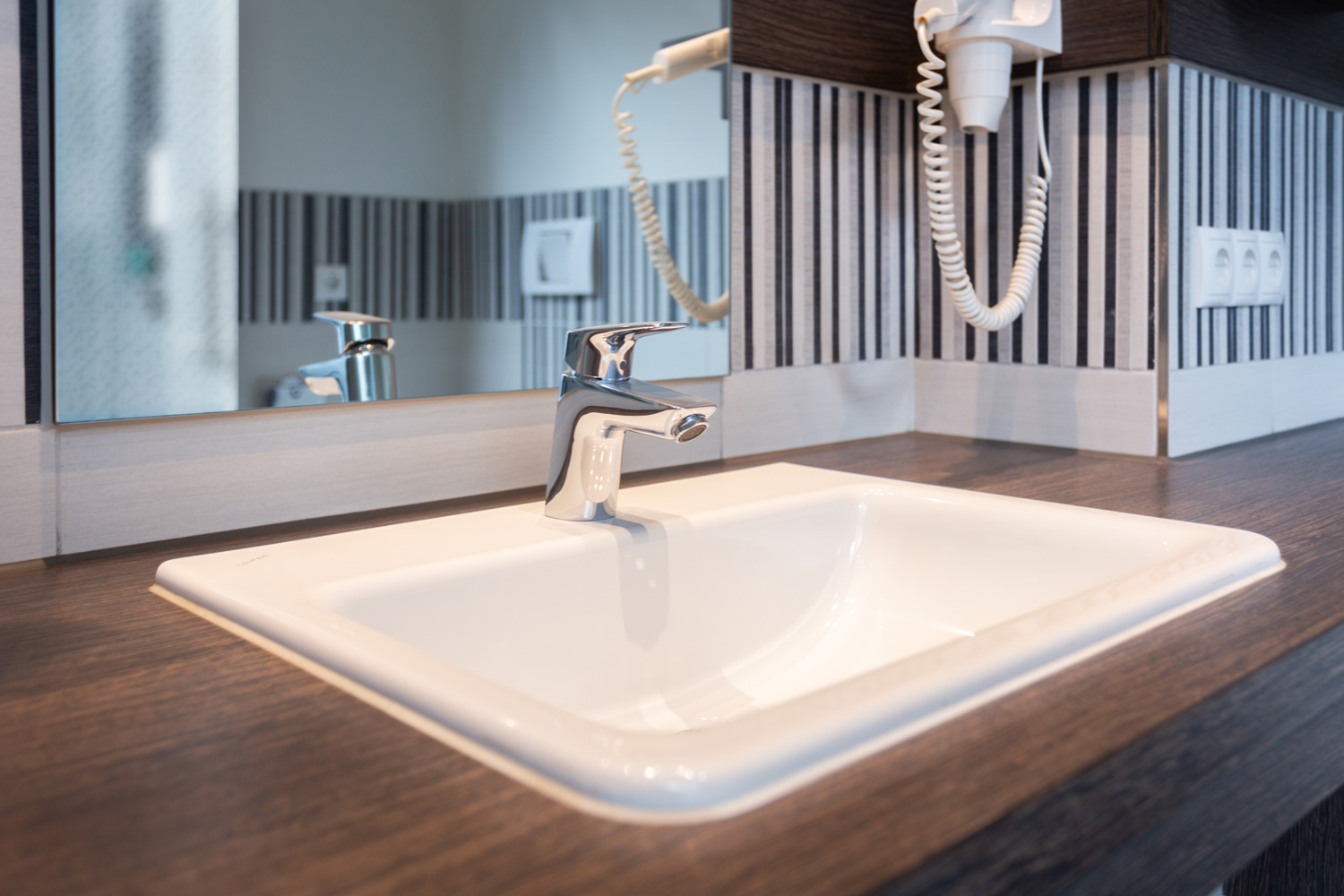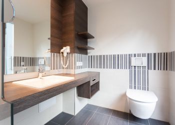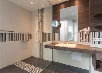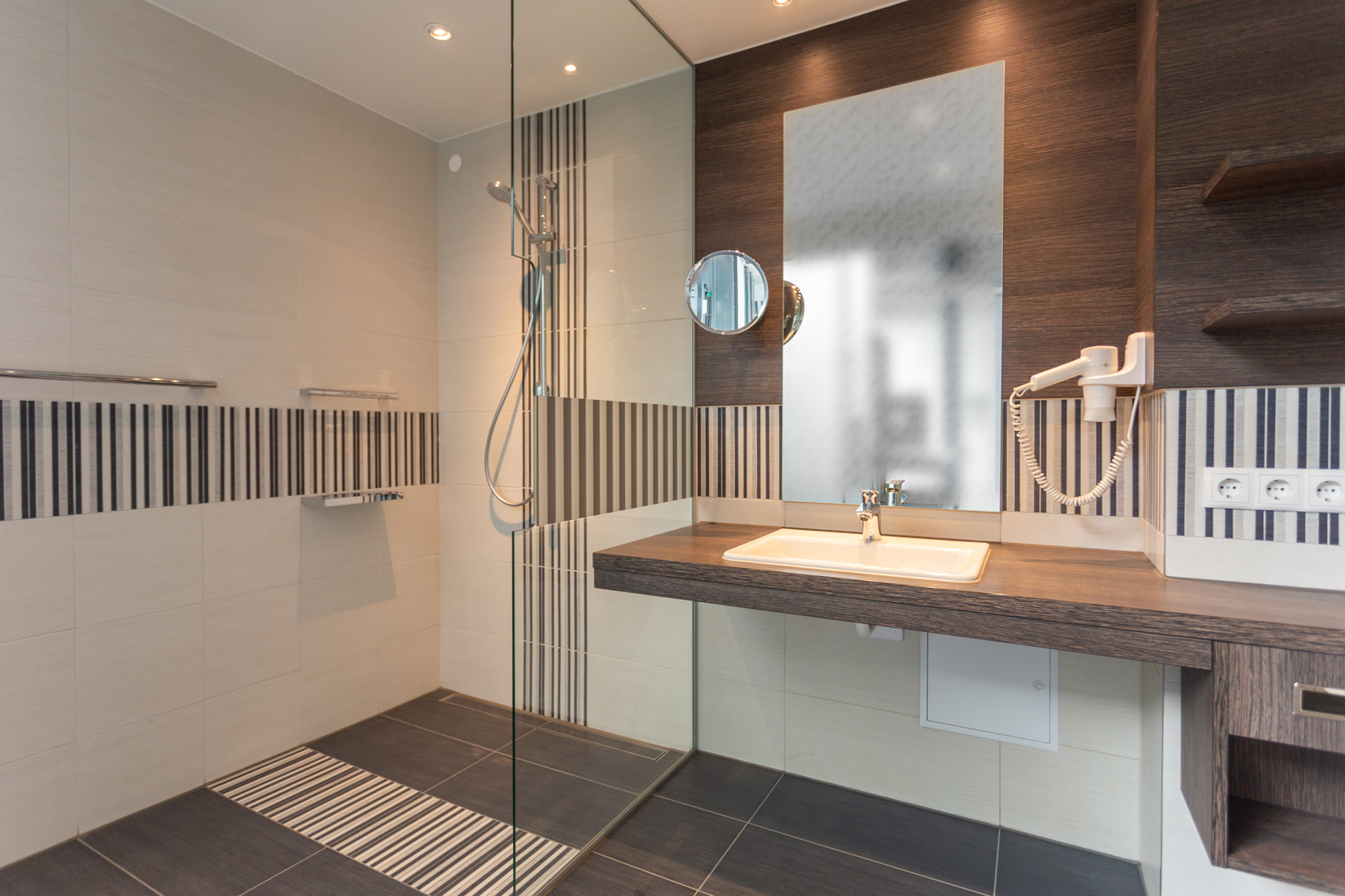 The barrier-free Allgäu ART Hotel in Kempten is unique. It offers families, business travelers and people with or without disabilities the opportunity to spend a relaxing stay in the center of Kempten. All 56 bathrooms are barrier-free and convince by the individual design. Each bathroom has a large entrance glass front, showing different motifs of the Allgäu region. The combination of tile, wood, glass and plaster rounds off the beautifully designed wellness bath.