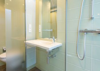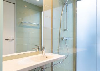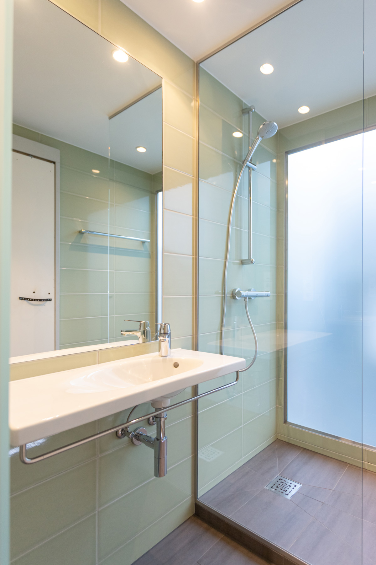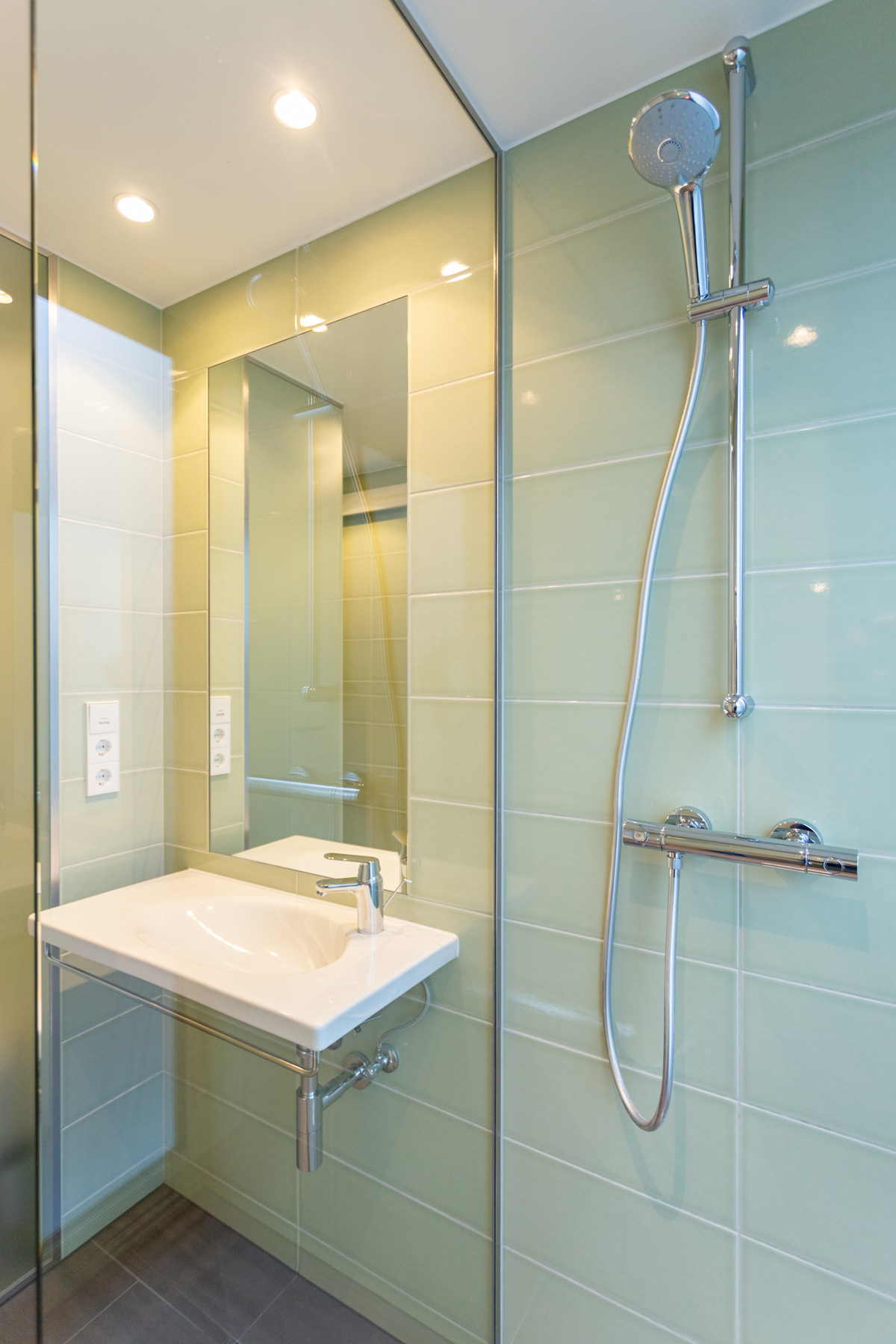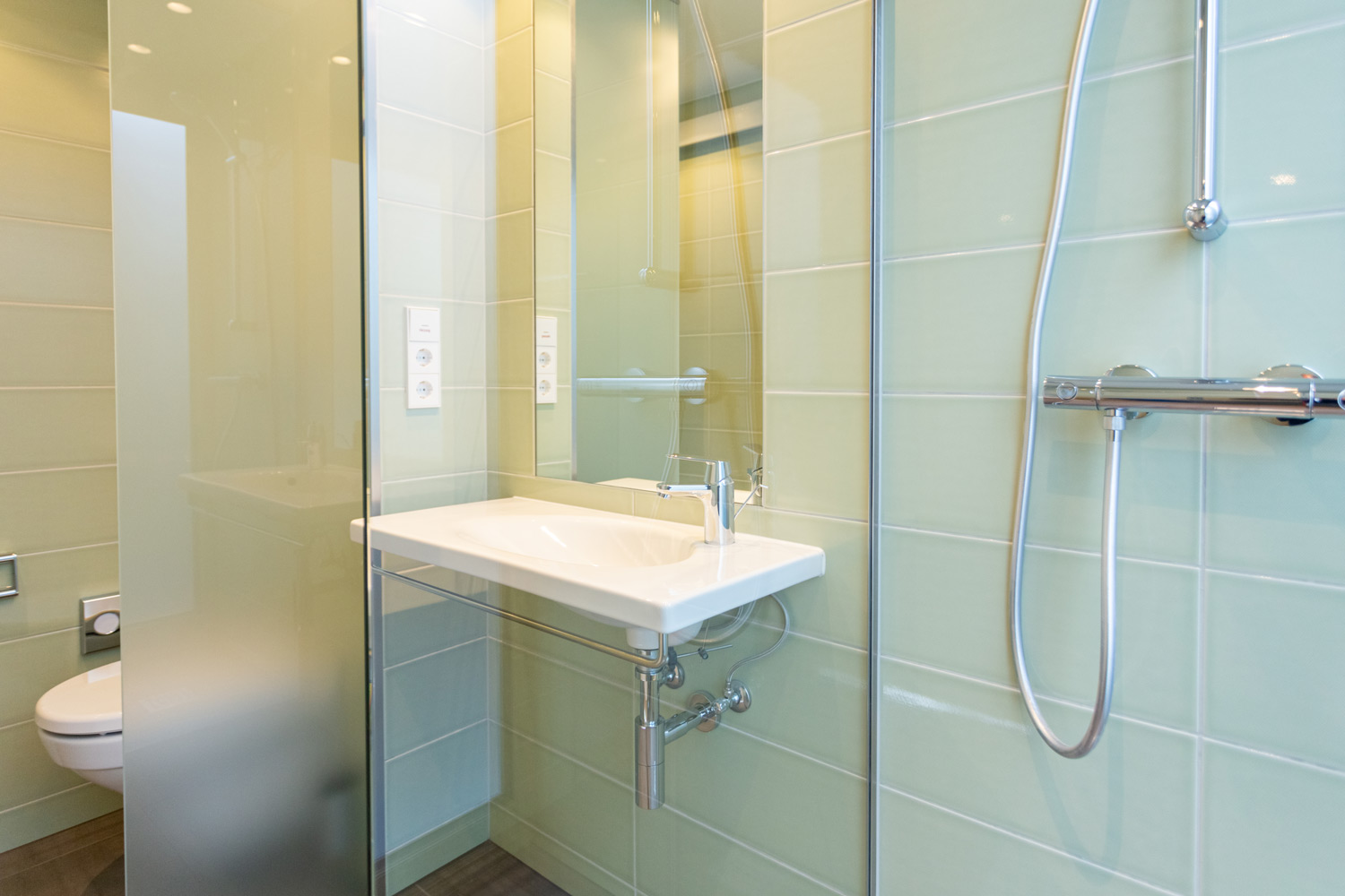 The new hotel building at Zollhafen in Mainz was completed with 188 TAIROS prefabricated bathrooms. The hotel is operated by the US hotel brand Super 8. When making the baths, all guidelines for obtaining the DGNB certification were taken into account. The special feature of this bathroom is the satin-finished glazing in the shower area.