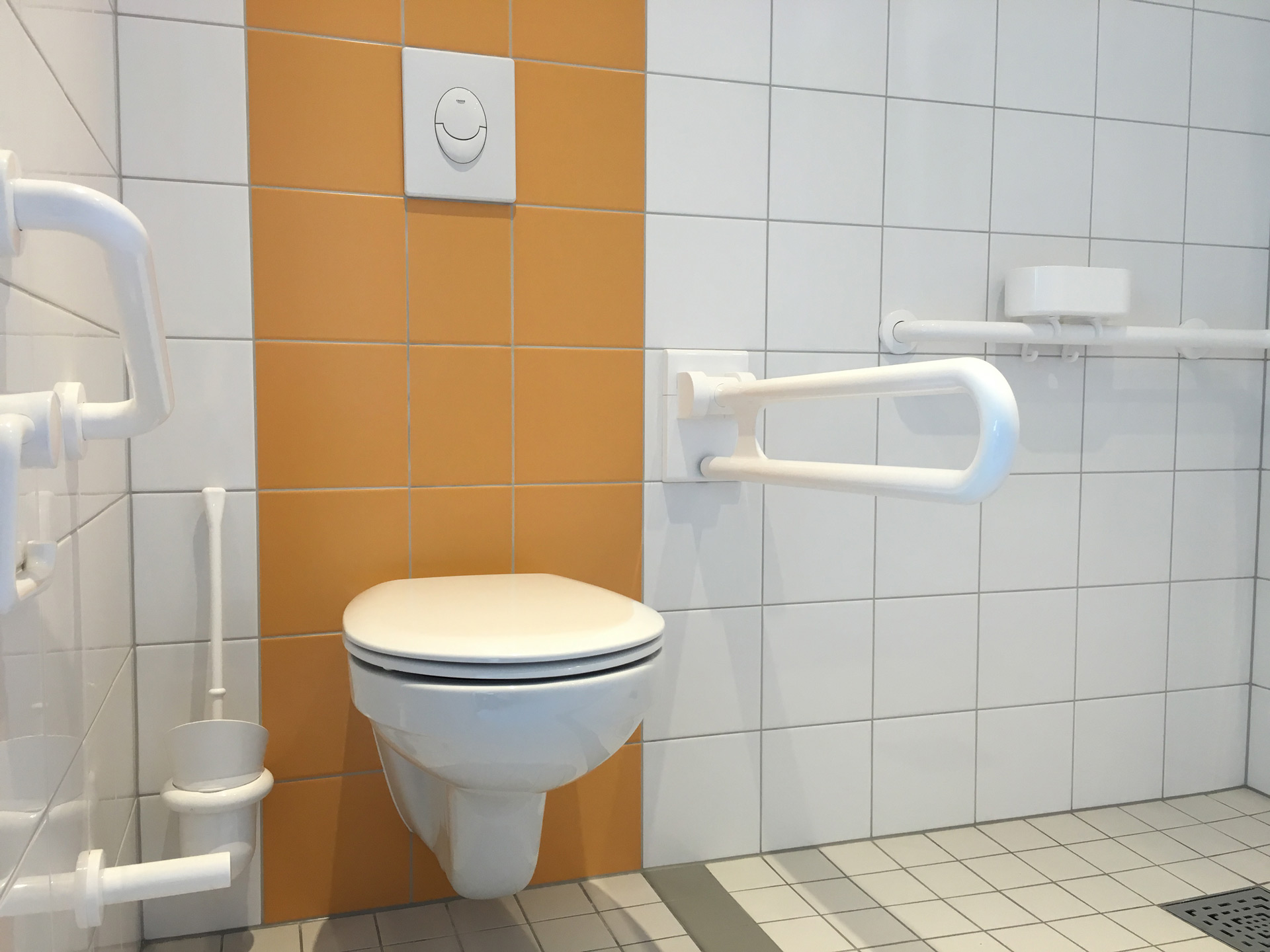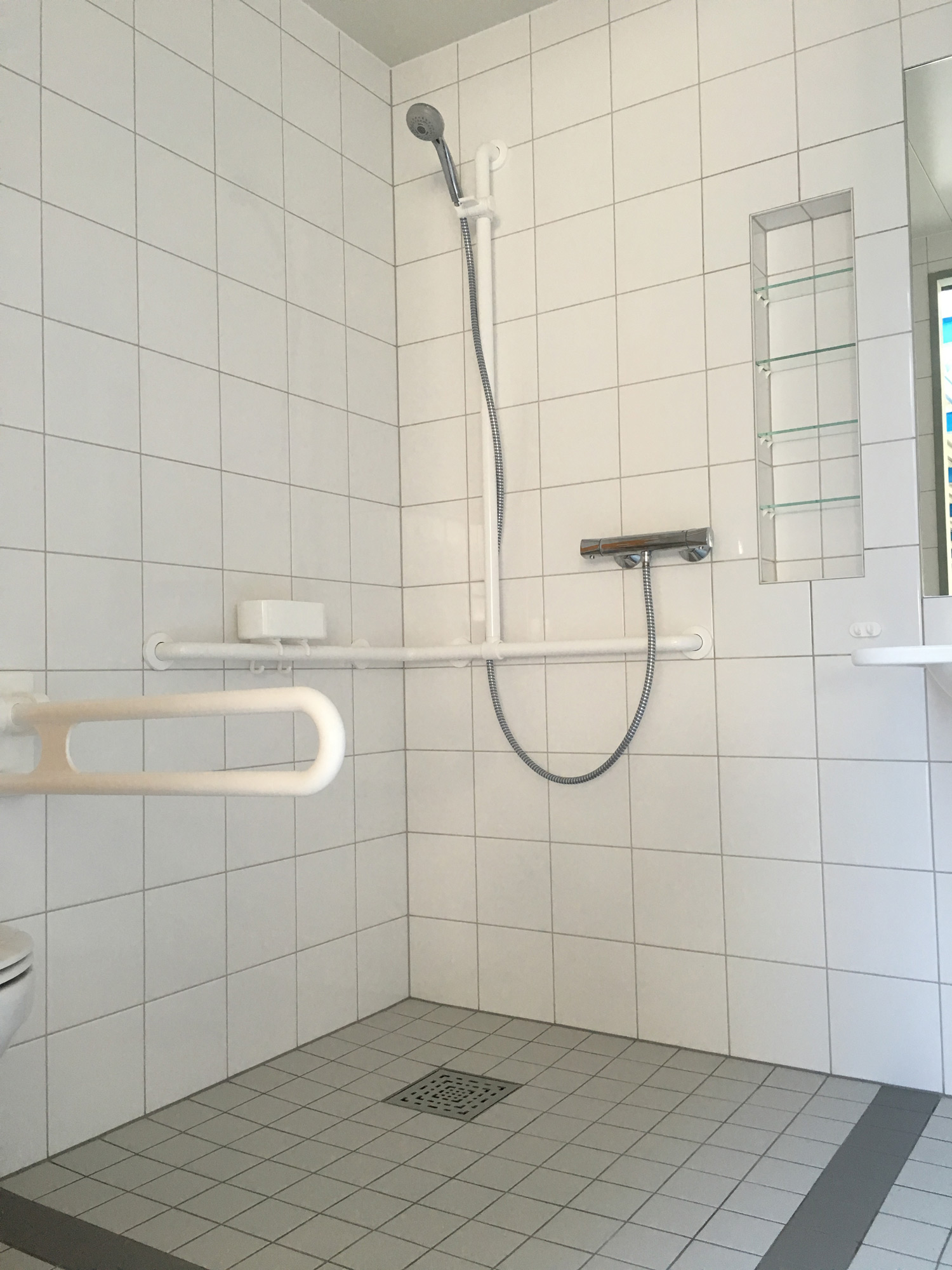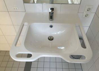 Für die Seniorenresidenz am Kurpark in Bad Staffelstein haben wir 126 Bäder geliefert. Durch die kontrastierenden Fliesen und ein eingefliestes Regal mit Glasböden wurden hier spezielle Akzente gesetzt.